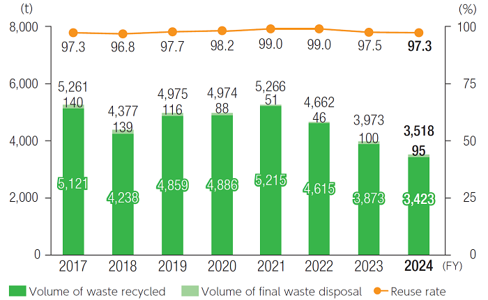 In Takara Shuzo plants, waste products generated include by-products such as shochu lees and other by-products, as well as wastewater treatment sludge, and shipping materials for raw ingredients, containers, etc. As a countermeasure, we are making efforts to reduce the volume of waste generated in our plants by revising disposal routes to enable the sale of industrial waste, repurposing food-based by-products (such as shochu lees) into feed and fertilizer and recycling waste paper from sake cartons. In fiscal year 2024, Takara Shuzo's waste generation was 3,518 tons, with a recycling rate of 97.3% against the target of 98.0%. For fiscal year 2025, we will continue our efforts to reduce waste and promote resource recovery, aiming to achieve the recycling rate target of 98.0%.