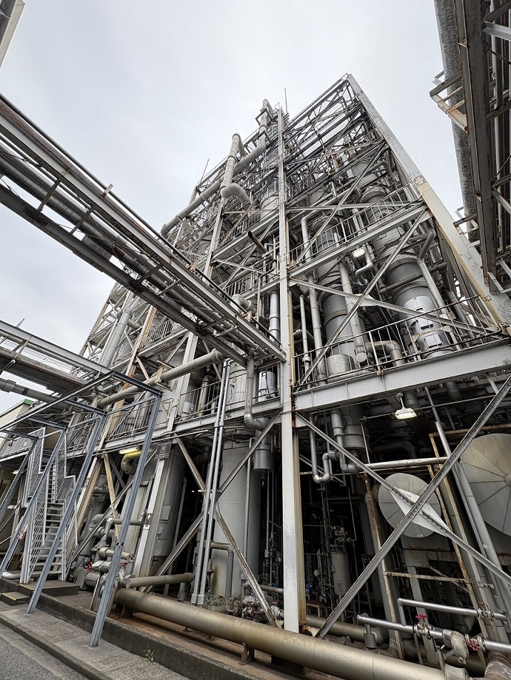 十数本の蒸留塔を有する松戸工場の蒸留機。最も高い塔は約35m、12階建てビルに相当する高さ