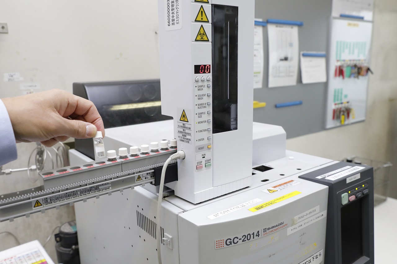 「また、渋みや辛さに関係する雑味成分などの不純物は、微量であっても最終製品の品質を左右します。極限まで雑味がなくピュアなアルコールにするため、製造プロセスのあらゆるタイミングで、品質チェックを実施しています。ガスクロマストグラフ(GC)という分析計測機器を使って蒸留途中の液を抜き出し不純物の濃度を測り、当社で規定している厳しい基準値をクリアできているかを入念に確認します」