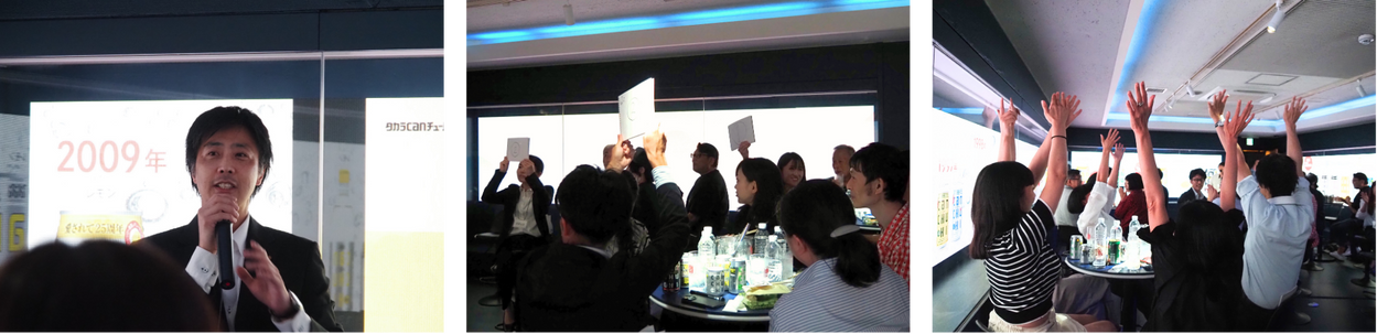 そして、ファンミーティングの目玉企画「テーブル対抗クイズ」を実施!企画担当の時田専任課長による進行で、タカラcanチューハイの歴史やフレーバーに関するクイズが出されます。