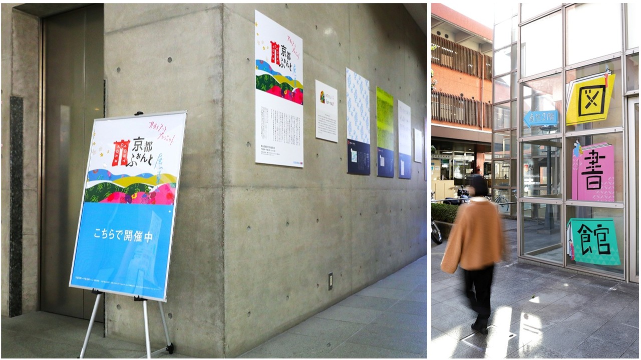 (左)「京都ふぉんと展 in 東山」の様子 (右)東山区役所庁舎1階 窓ガラスの図書館案内サイン