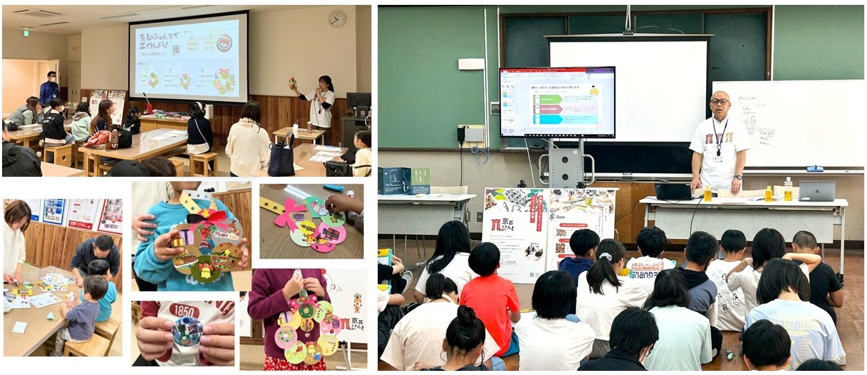 (左上)京都ふぉんと×さすてな京都コラボイベン ト。親子でクリスマスリースと缶バッジ作りに挑戦する様子 (右)2025年7月 京都市立待鳳小学校での出前授業の様子