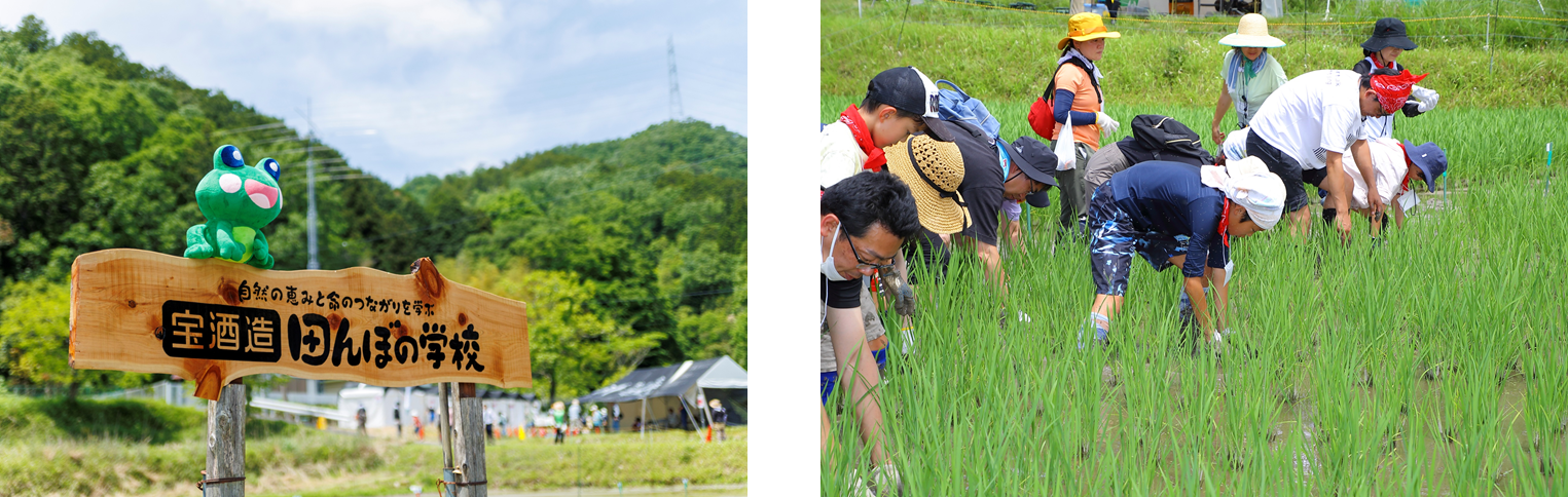 宝酒造では、2004年より、次世代を担う子どもたちに自然環境や生物多様性を守ることの大切さや、自然の恵みのありがたさを伝えることを目的として、環境教育プログラム・宝酒造「田んぼの学校」を開催しています。毎年年3回、小学生とそのご家族を対象に、京都府南丹市の田んぼで、春の田植えから秋の収穫までの稲作体験や、里山の自然観察の授業を行っています。